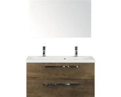 Badkamermeubelset Seville 100 Cm Kunststeen Wastafel 2 Kraangaten Incl. Spiegel Tabacco