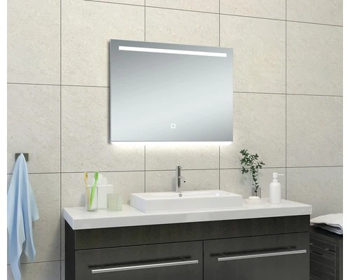 De spiegel heeft bovenin de spiegel een geïntegreerde horizontale lichtbalk. Onderaan de spiegel plaatst u indirect een LED strip, waardoor er een mooie lichtgloed ontstaat tussen de spiegel en uw wastafel. Door de in het glas verwerkte touch-button kunt u de kleursterkte en kleurtemperatuur eenvoudig en geleidelijk naar uw eigen behoefte instellen verstelbaar van 2700 tot 6400 Kelvin. De LED verlichting (energielabel A) heeft een gebruiksduur van ongeveer 50.000 branduren en geeft 750 lumen.